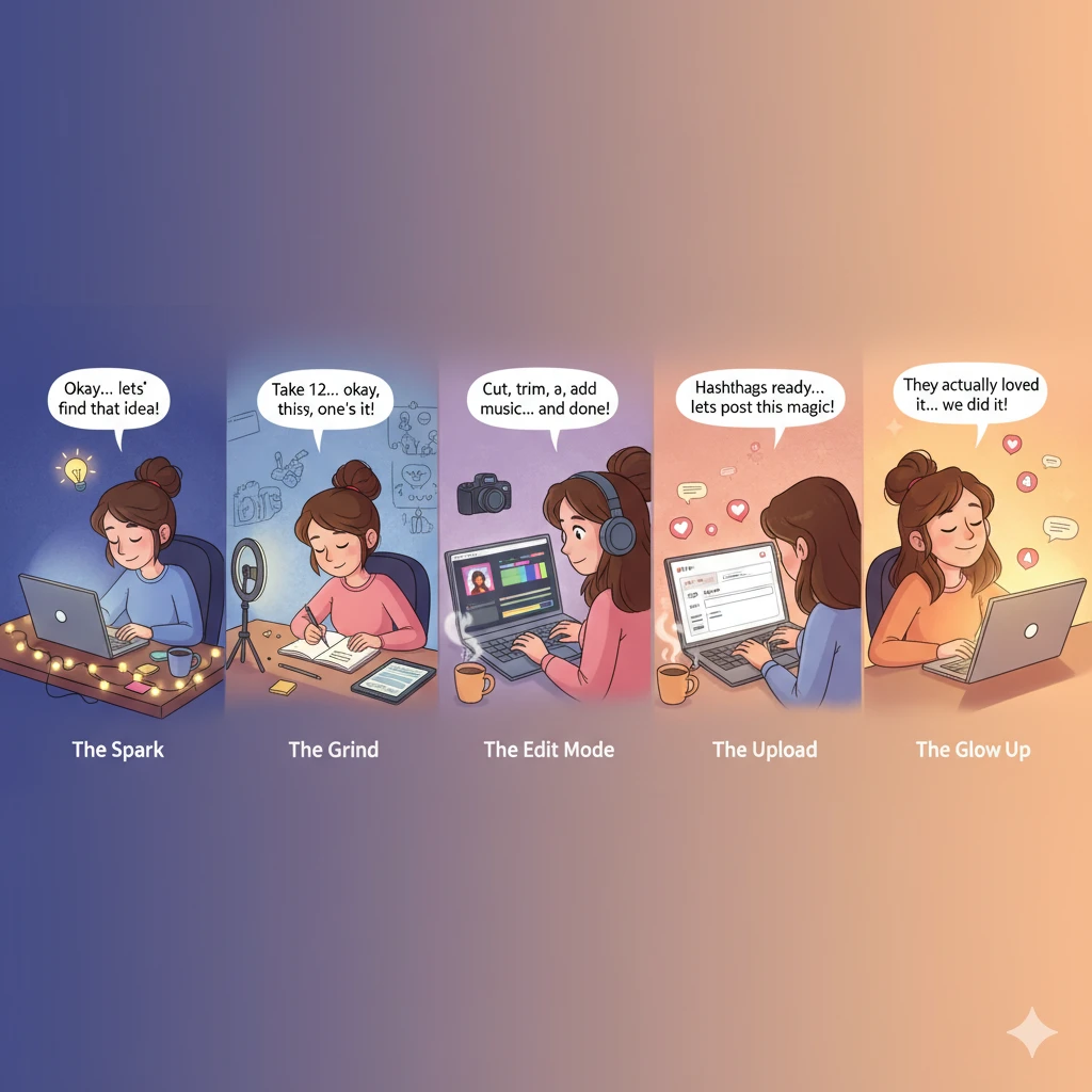 Every creator begins with one tiny spark, a thought, a trend, or even a late-night “wait, this could go viral” moment. We scroll, observe, and listen to what people are talking about… then twist it into something that feels real, valuable, and fresh.